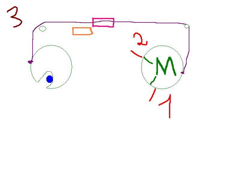 Смотрим рисунок 1. Зеленый круг слева – защелка дверного замка, который стоит штатно в машине. Рядом с ним синий кружок – та деталь, которая стоит на стойках автомобиля, за которую замок и держится. Дальше идет дополнительное оборудование – справа зеленый кружок с буквой “М” – моторчик электропривода, я взял от стеклоподъемника. От него к защелке замка идет тросик – фиолетового цвета. На тросике сделан герконовый датчик – красный и оранжевый прямоугольники. Обращаем внимание на метки положения моторчика – там их две. Сейчас первый рисунок – это дверь полностью открыта, моторчик стоит в первом положении, тросик ослаблен, датчик разомкнут.